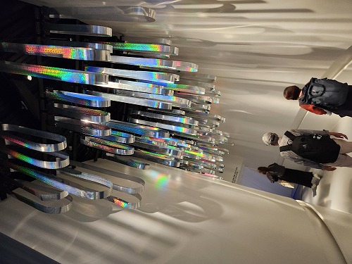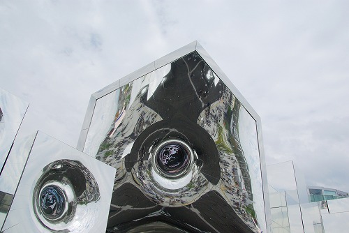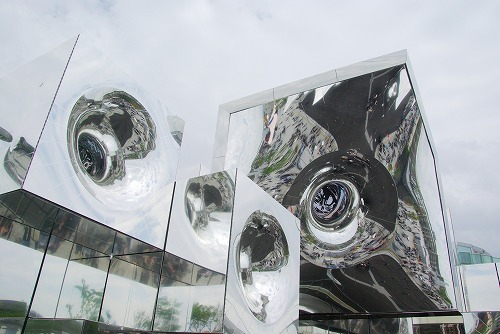 シンボルの赤い球体は約17000枚の4種類の赤いアルミのディスクで覆われている