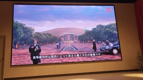 映像6(動画) 大きなスクリーンにタイの文化・食べ物などが映し出される映像,その前を人が往き来する