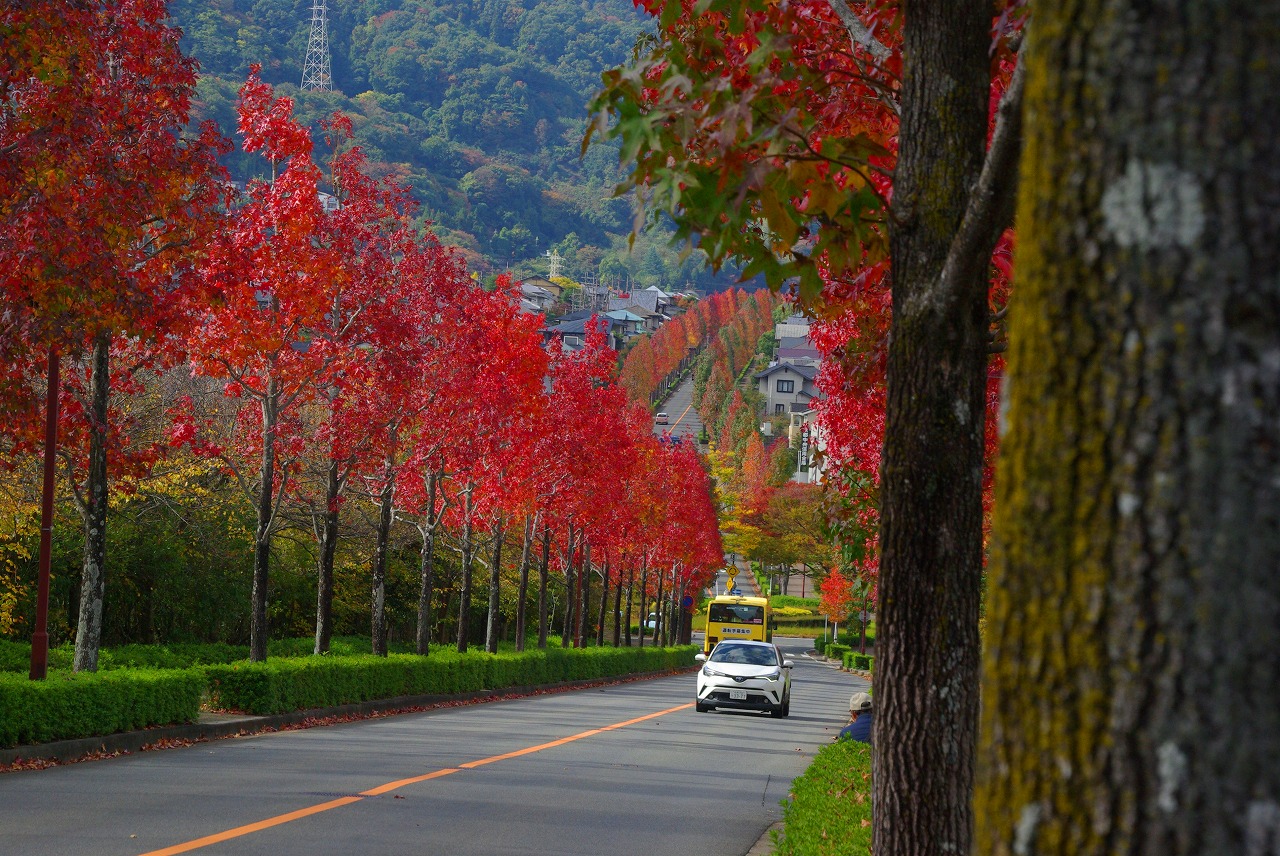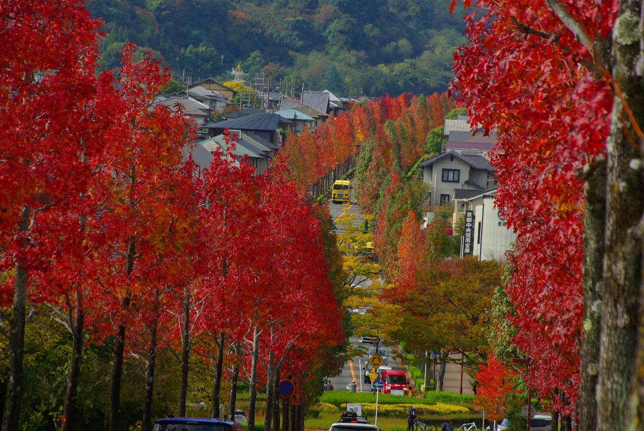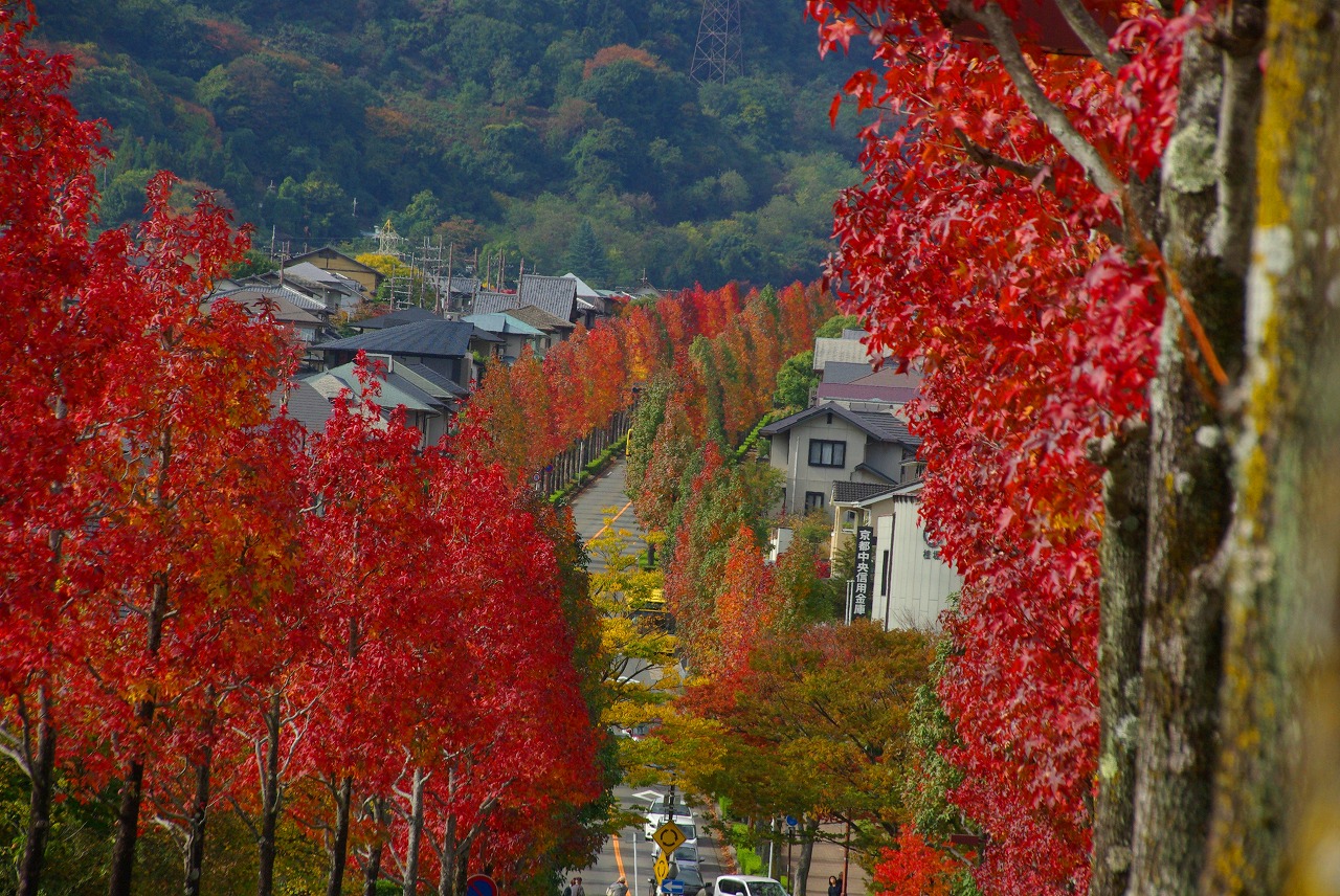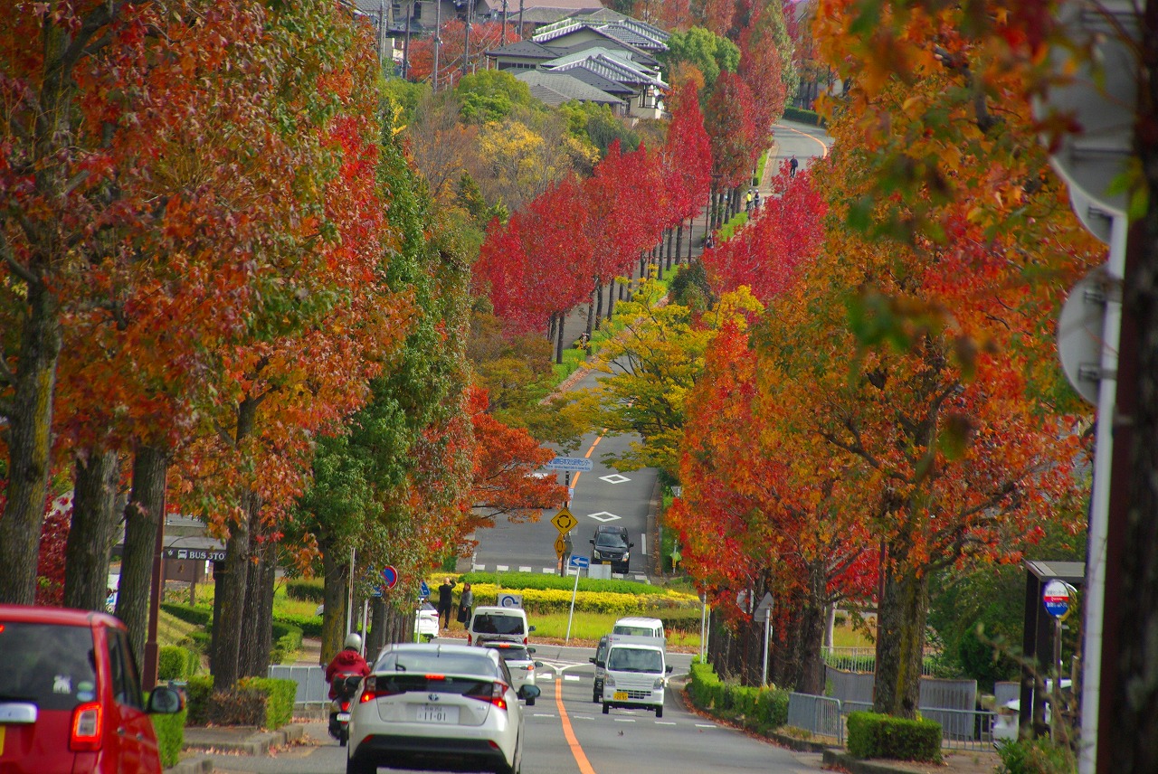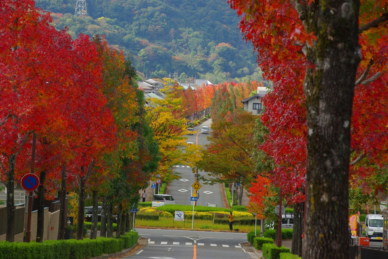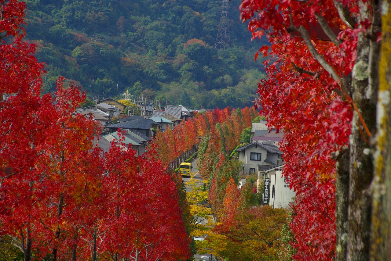 望遠レンズで桂坂のロータリーの東側の並木道を望む(真っ赤に紅葉しているのが見える)