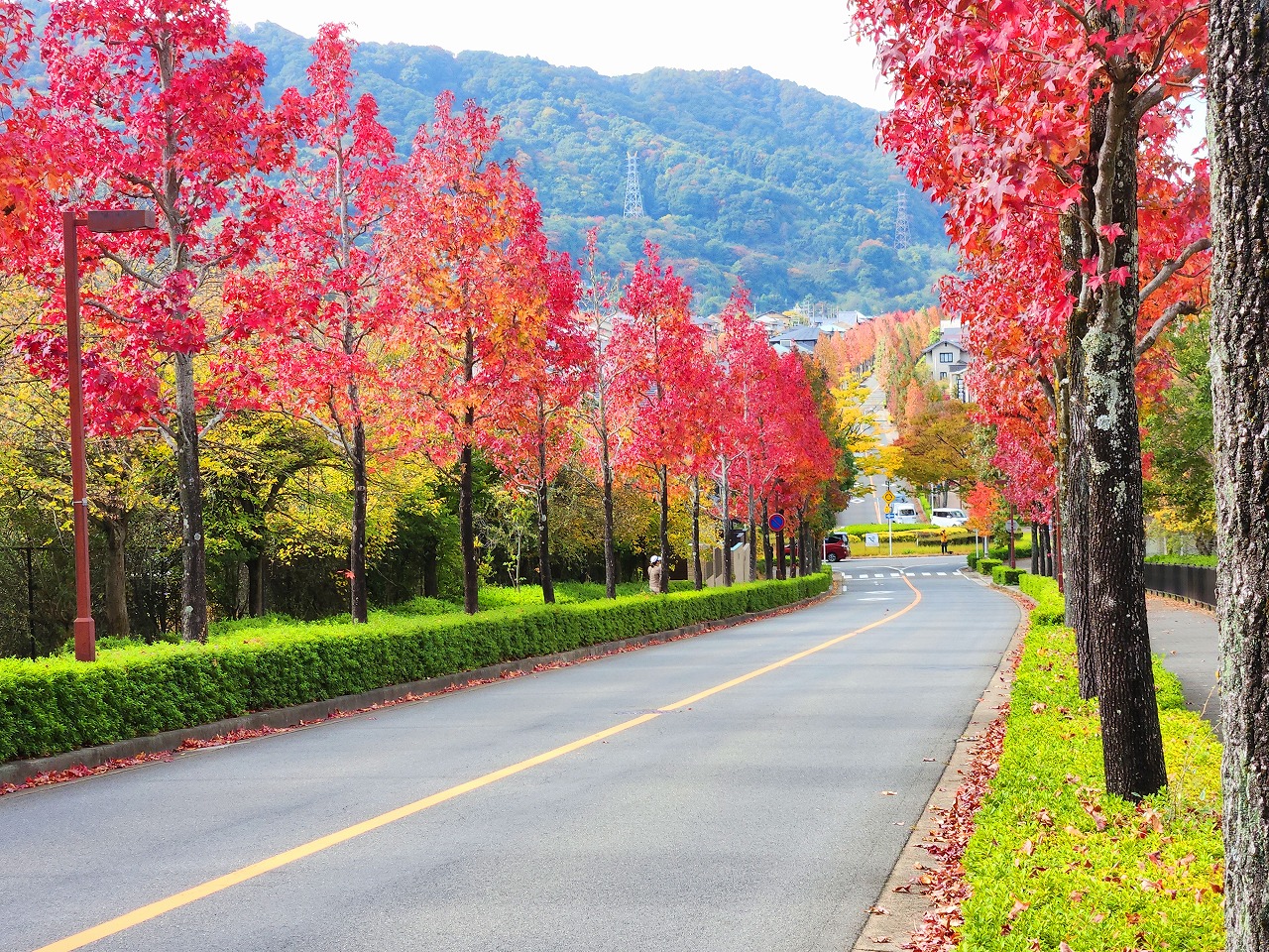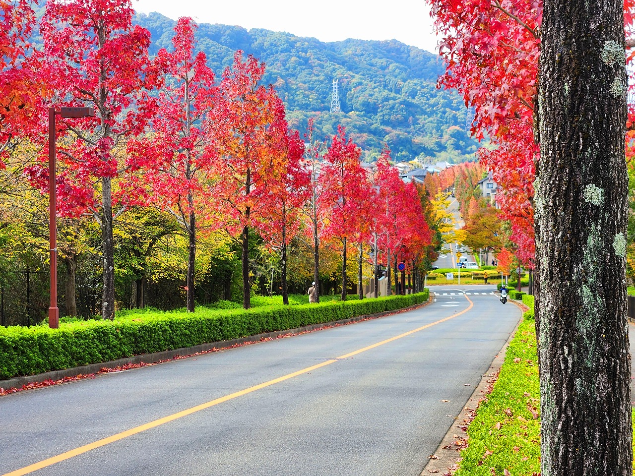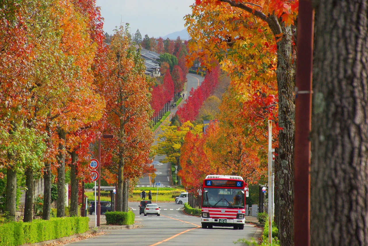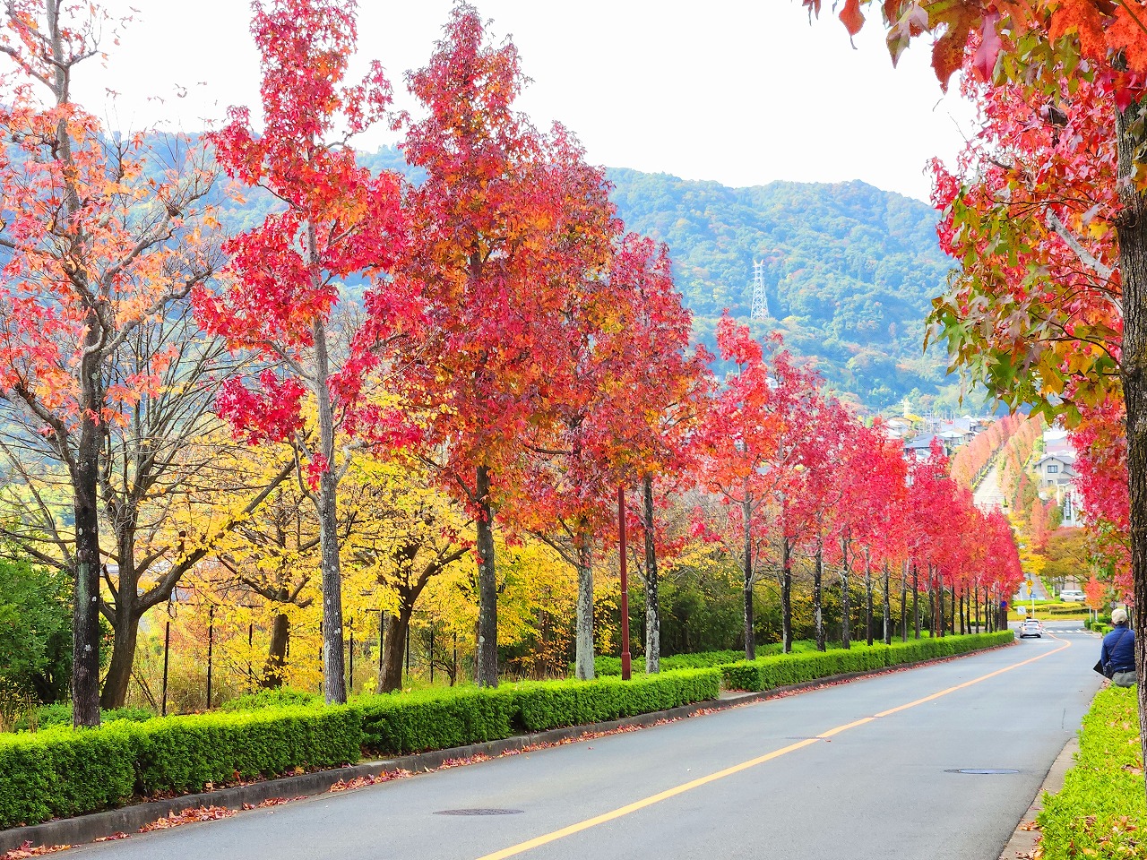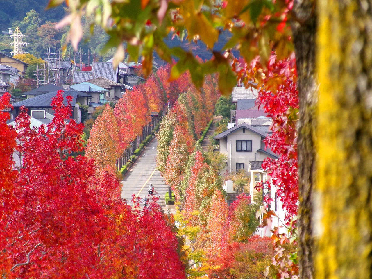 望遠レンズで桂坂のロータリーの東側の並木道を望む(真っ赤に紅葉しているのが見える)