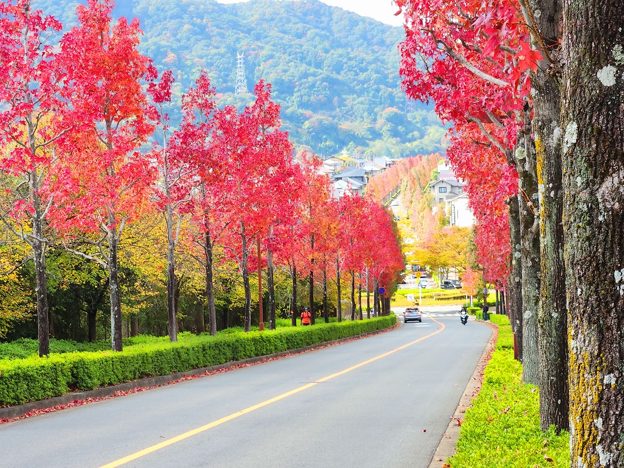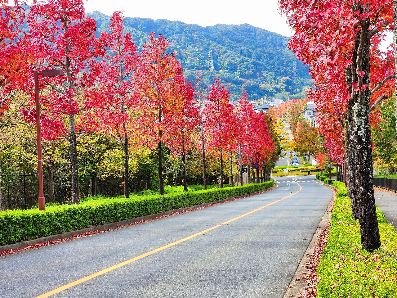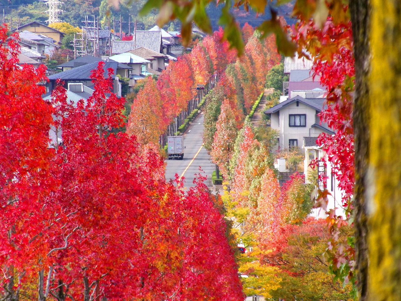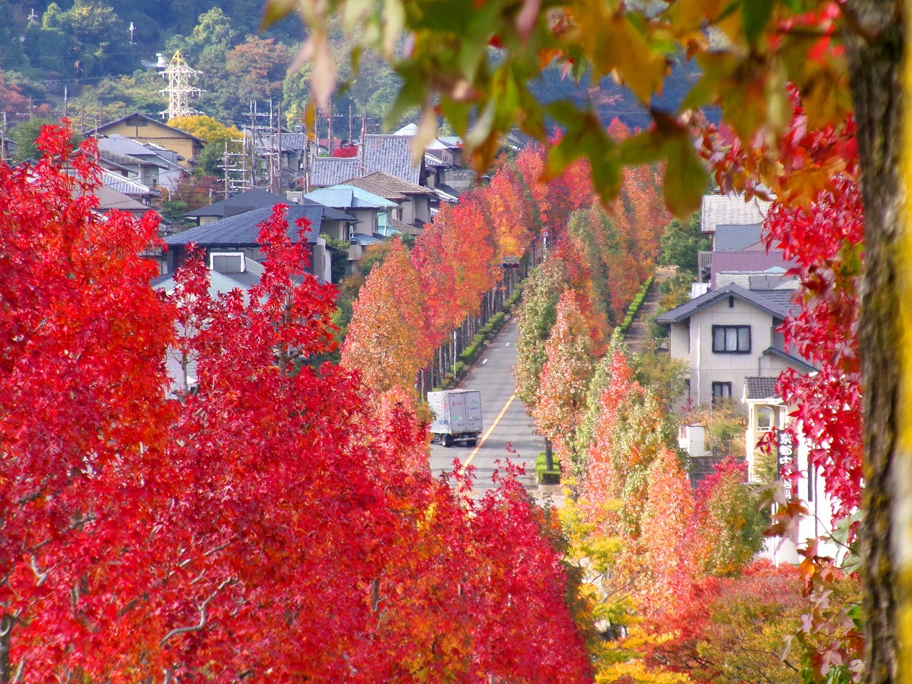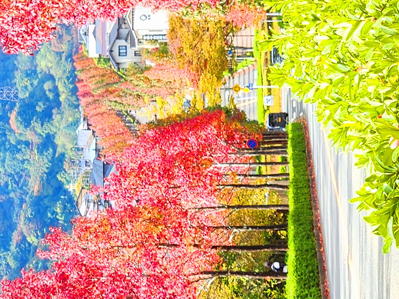 望遠レンズで桂坂のロータリーの東側の並木道を望む(真っ赤に紅葉しているのが見える)