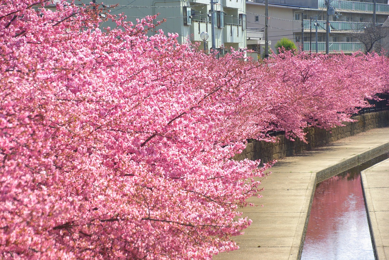 春の訪れを一番早く感じる淀水路の河津桜。満開が近いとの情報があり出掛けた。